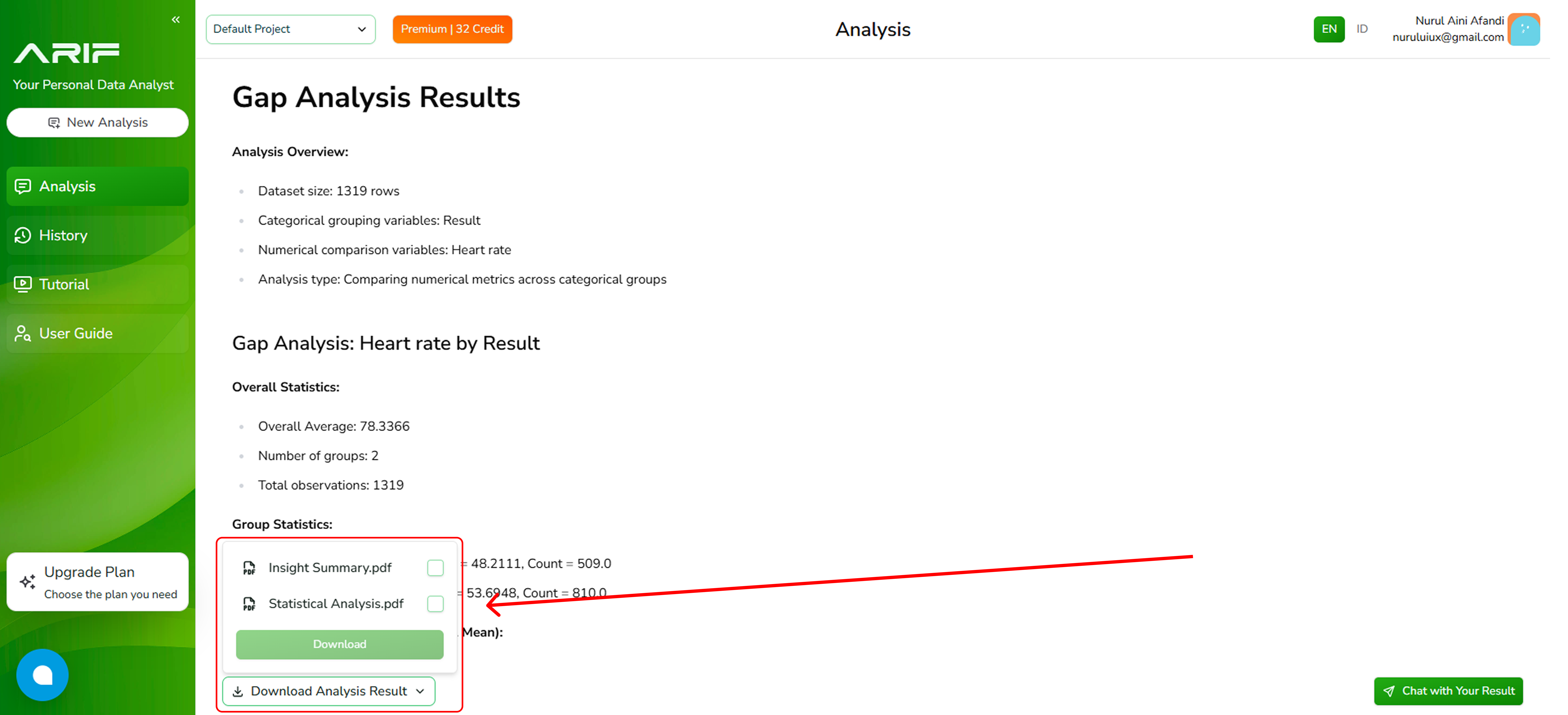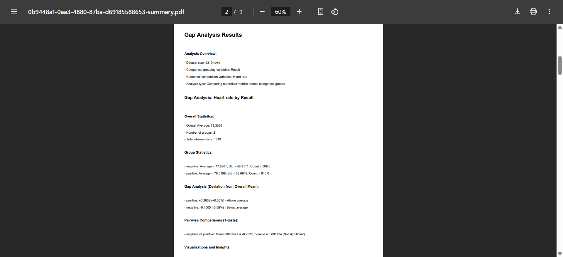 - Then Press “Download Analysis Result” to choose the file type you want to download. You can select Insight Summary for a curated, high-level overview, or Statistical Analysis for insights with statistical calculation.