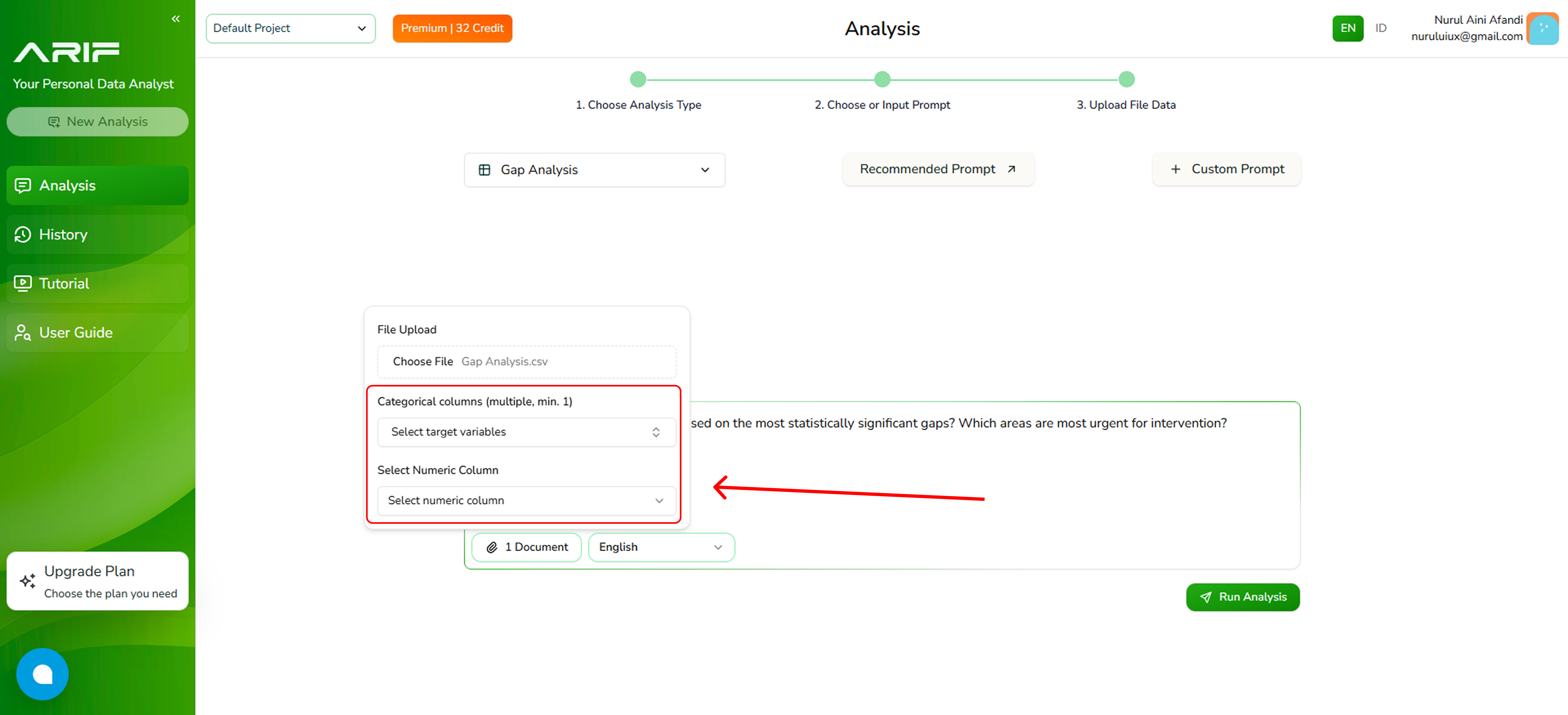 - Click “Choose analysis type” dropdown in the main menu then select “Gap Analysis”.