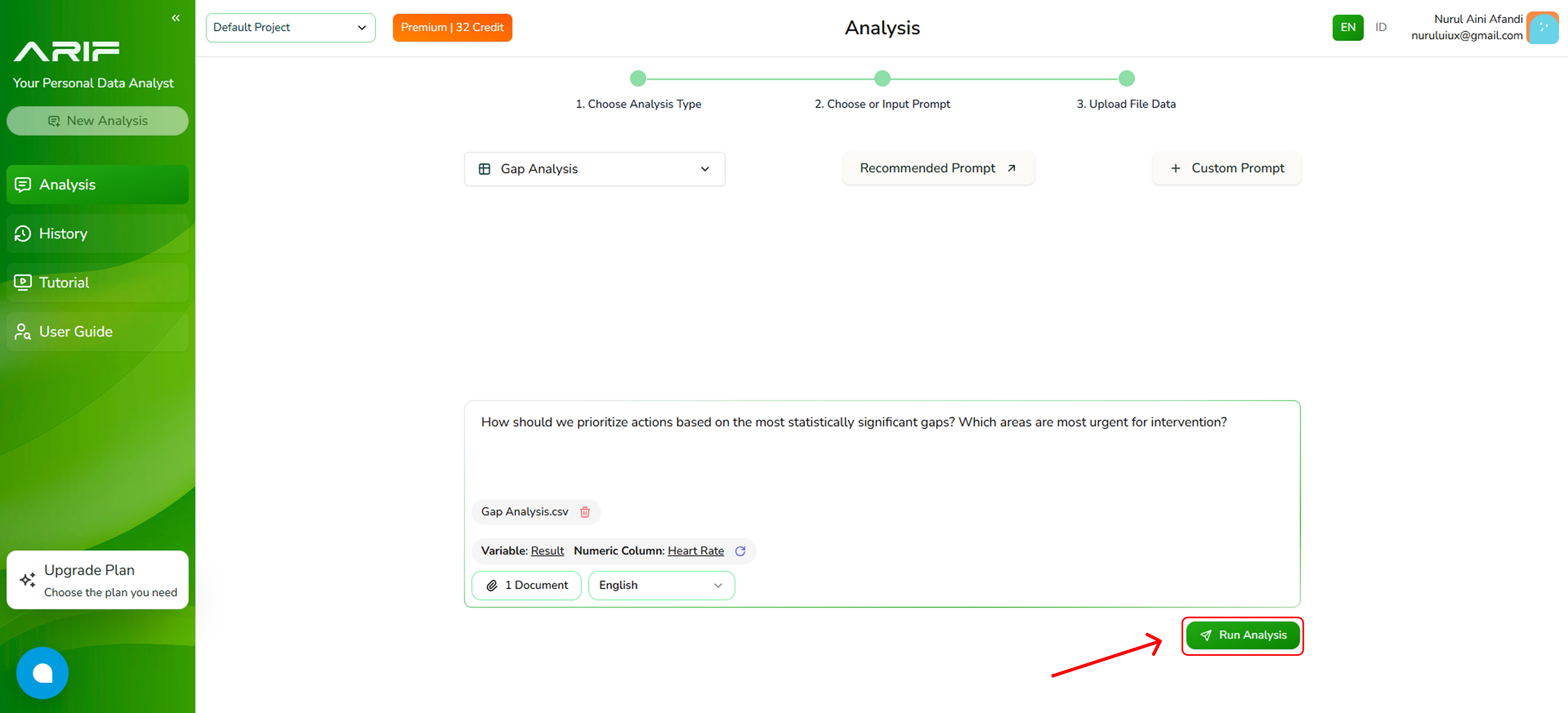 - Make sure you’ve selected the correct prompt and file, then click “Run Analysis” and wait for the system to process your data. The processing time depends on the file size.