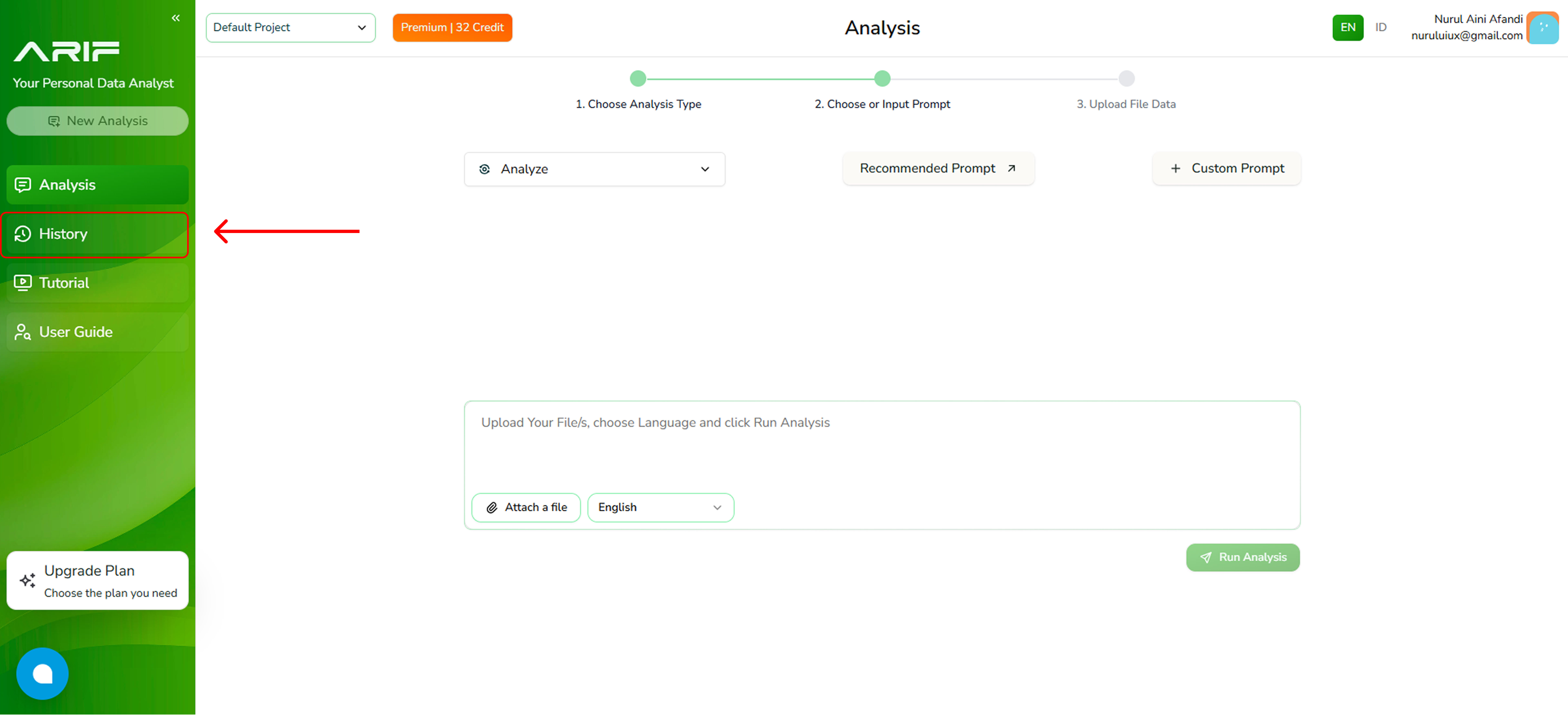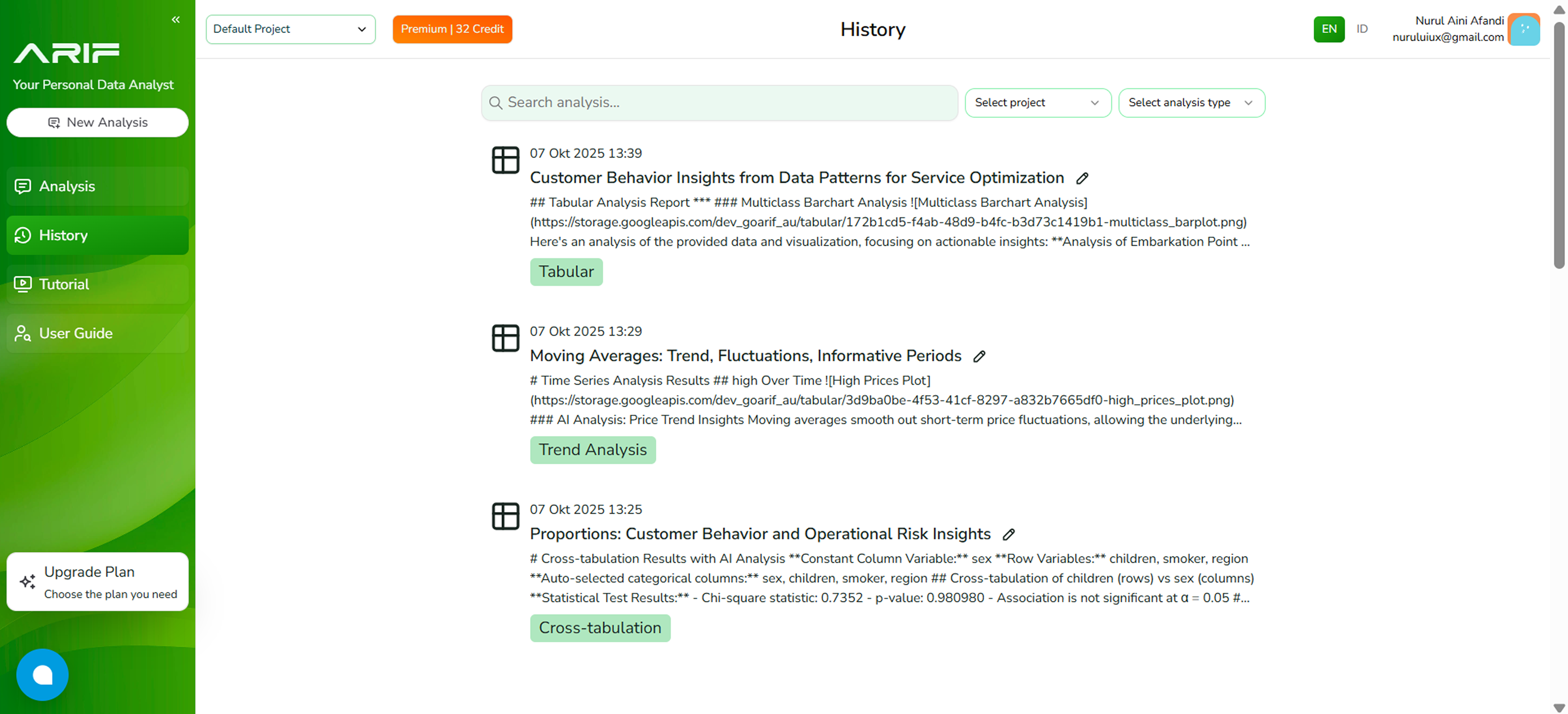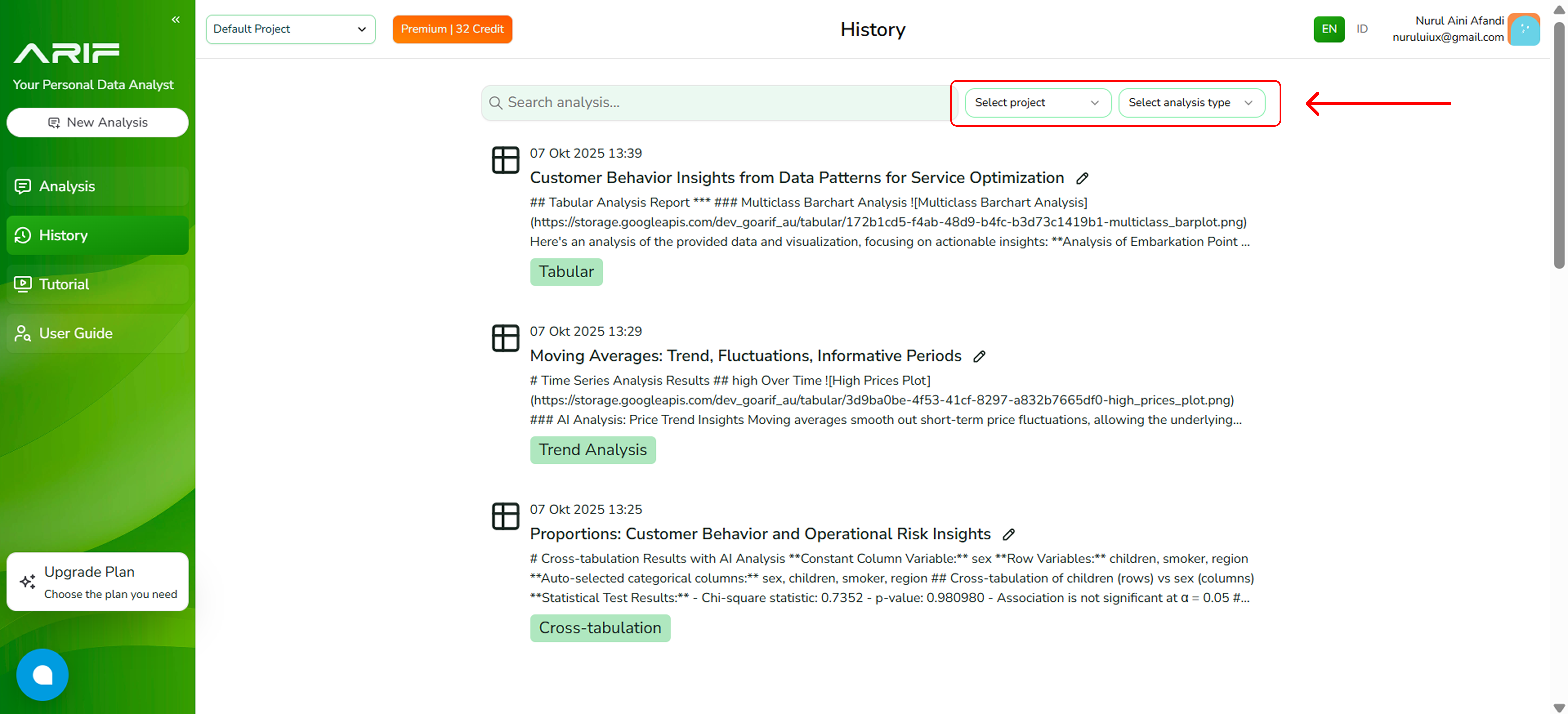 - The history can be filtered by team project or analysis type, making it easier to manage and locate previous work.