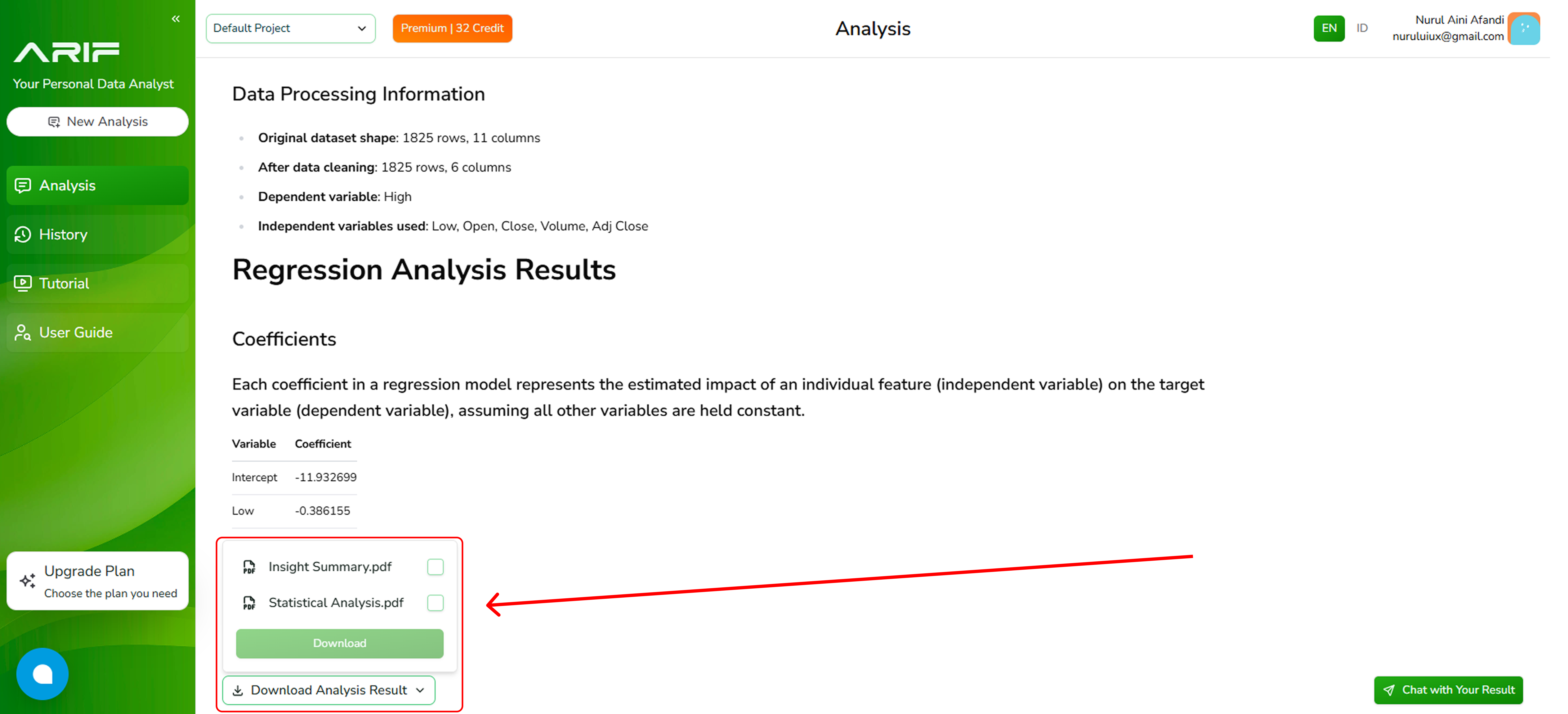 - Then Press “Download Analysis Result” to choose the file type you want to download. You can select Insight Summary for a curated, high-level overview, or Statistical Analysis for insights with statistical calculation.