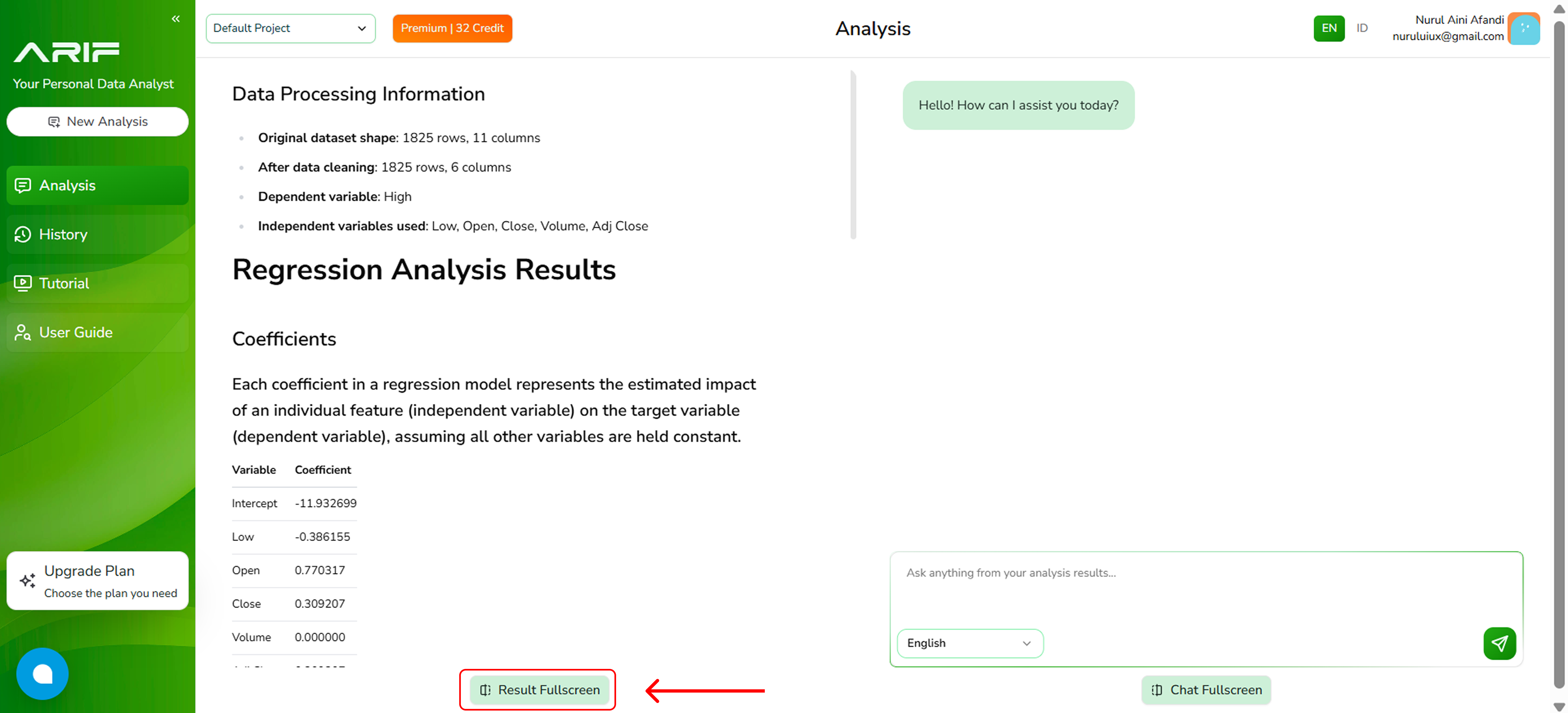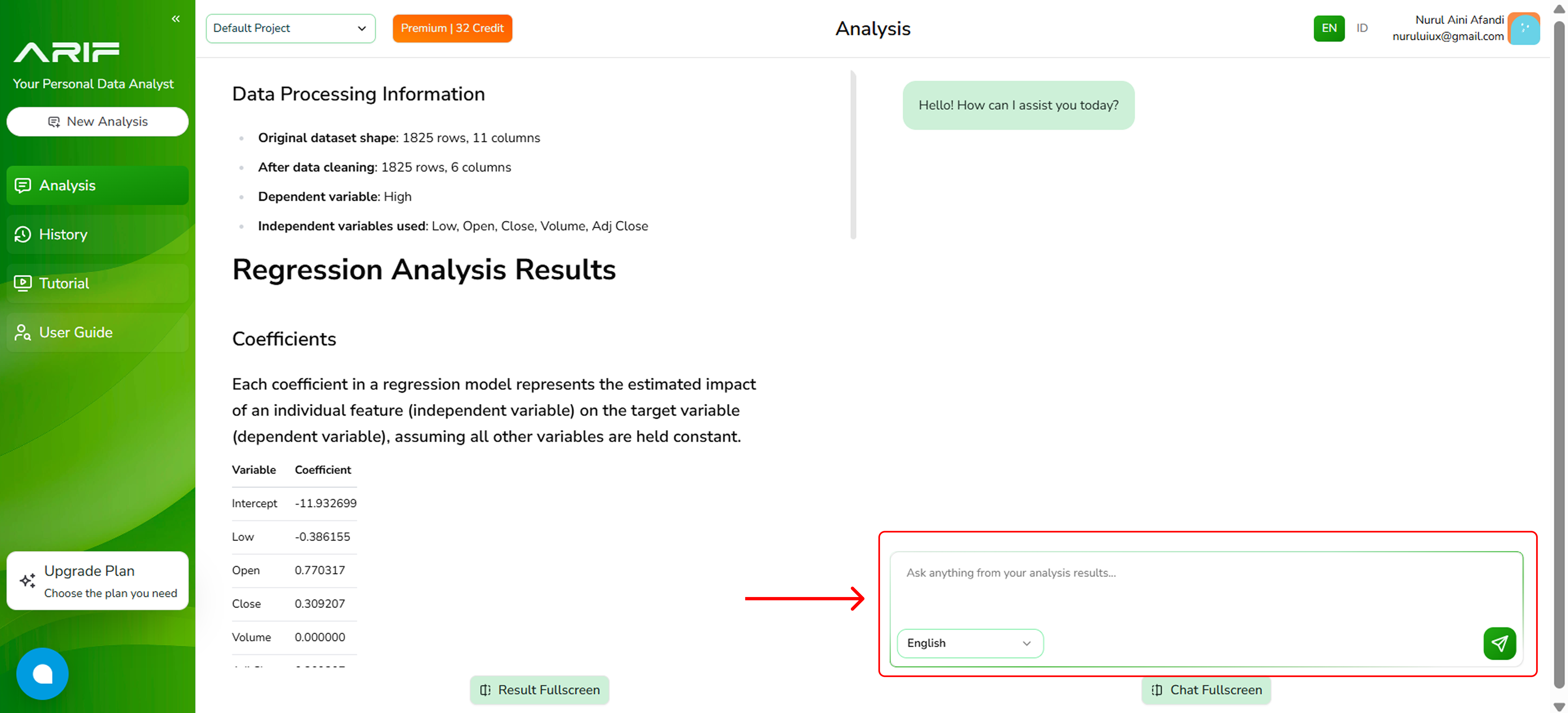 - The analysis results will appear on the left panel, while the right panel allows you to ask follow-up questions about the analysis.