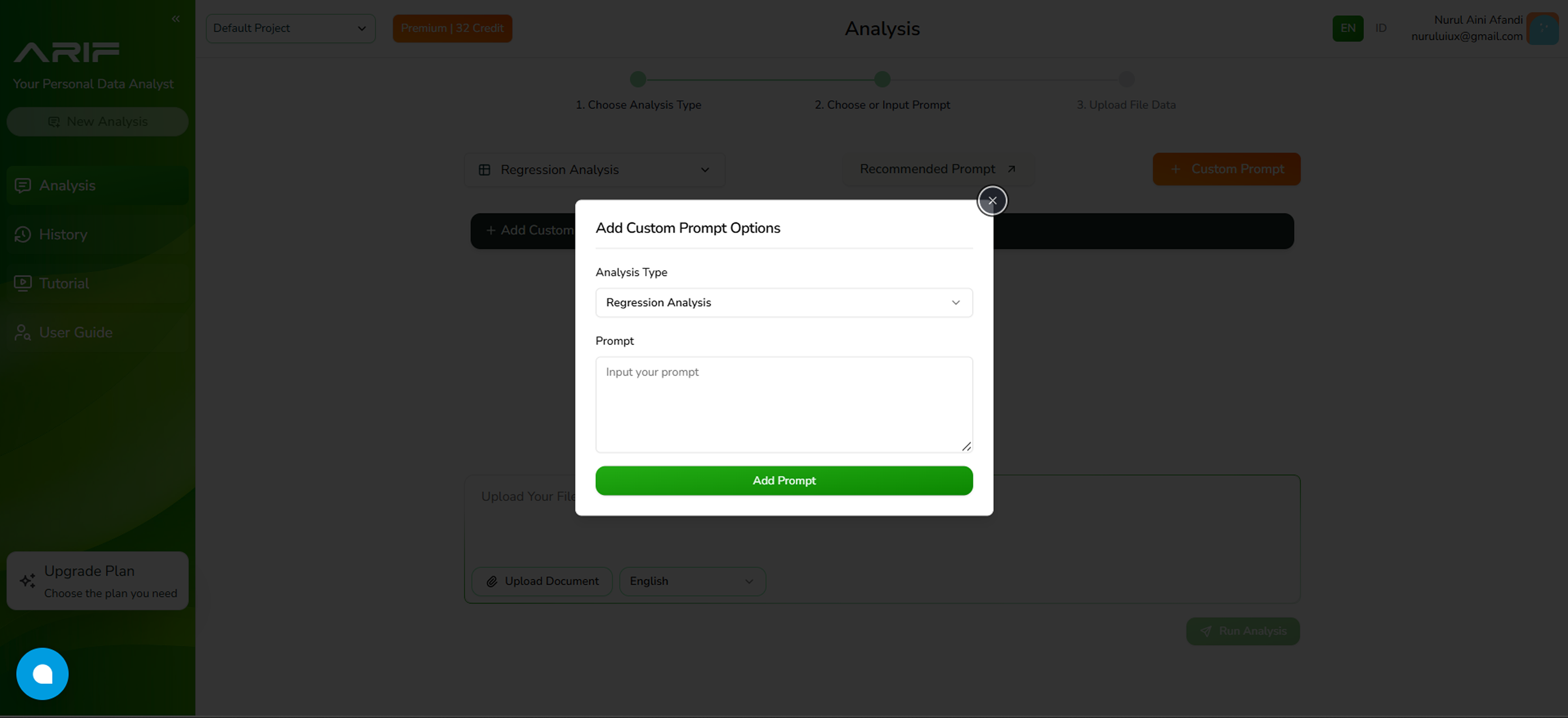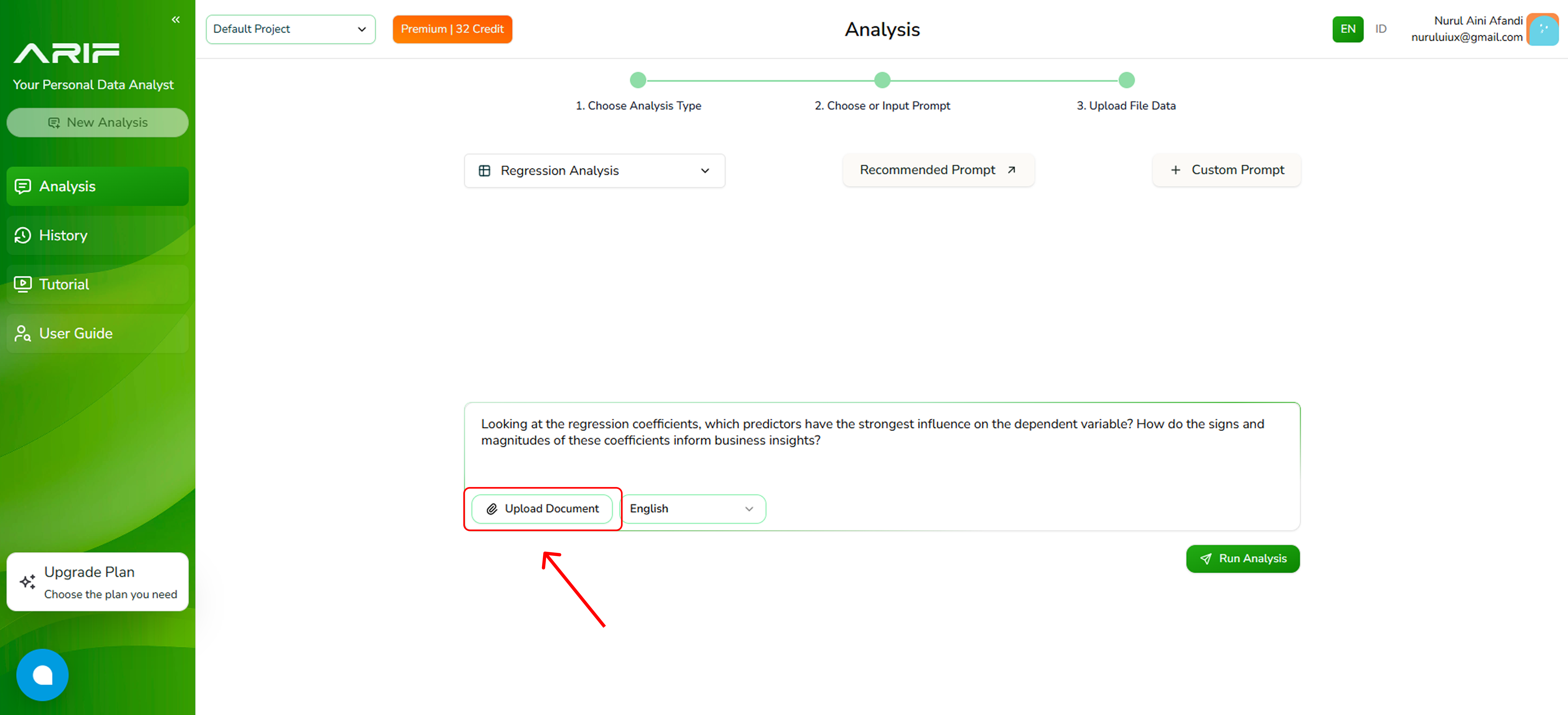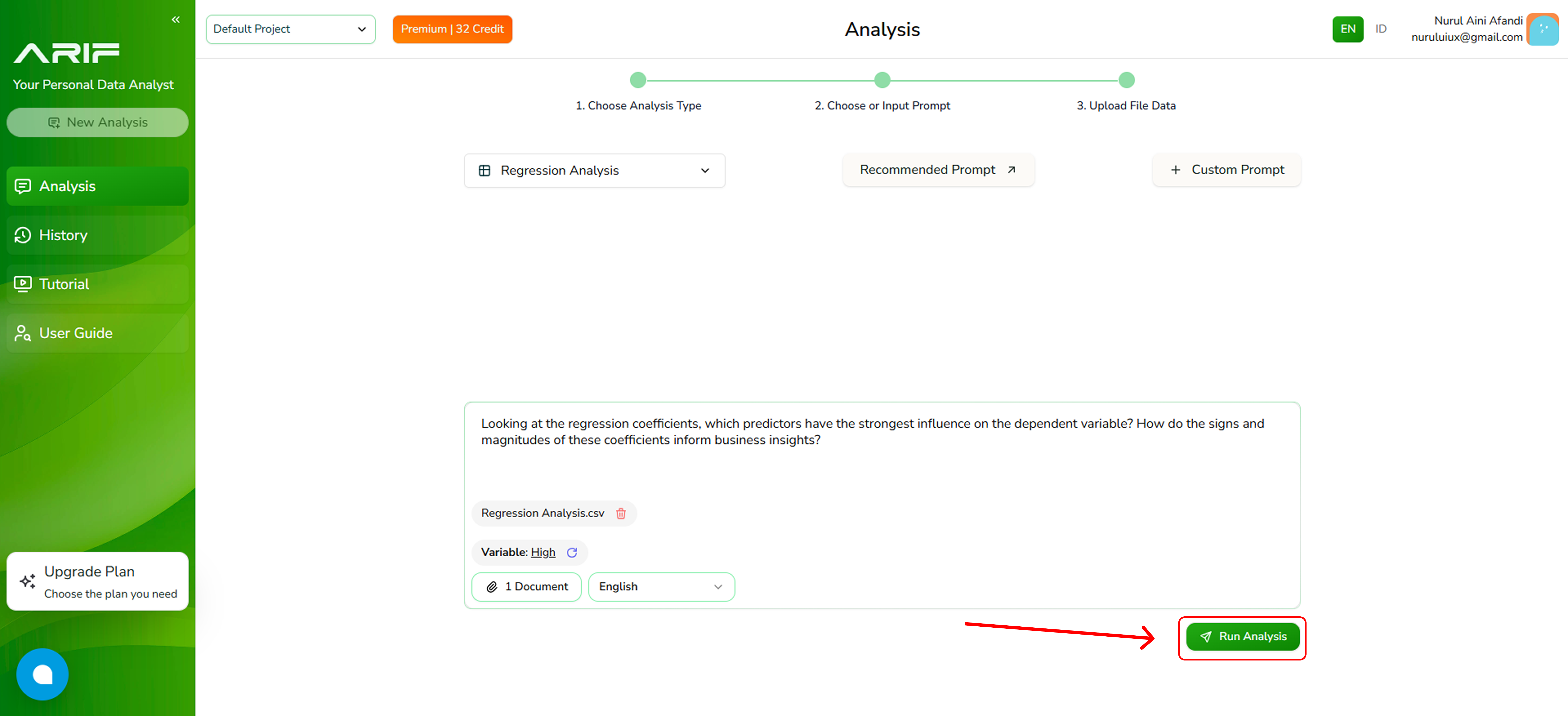 - Make sure you’ve selected the correct prompt and file, then click “Run Analysis” and wait for the system to process your data. The processing time depends on the file size.