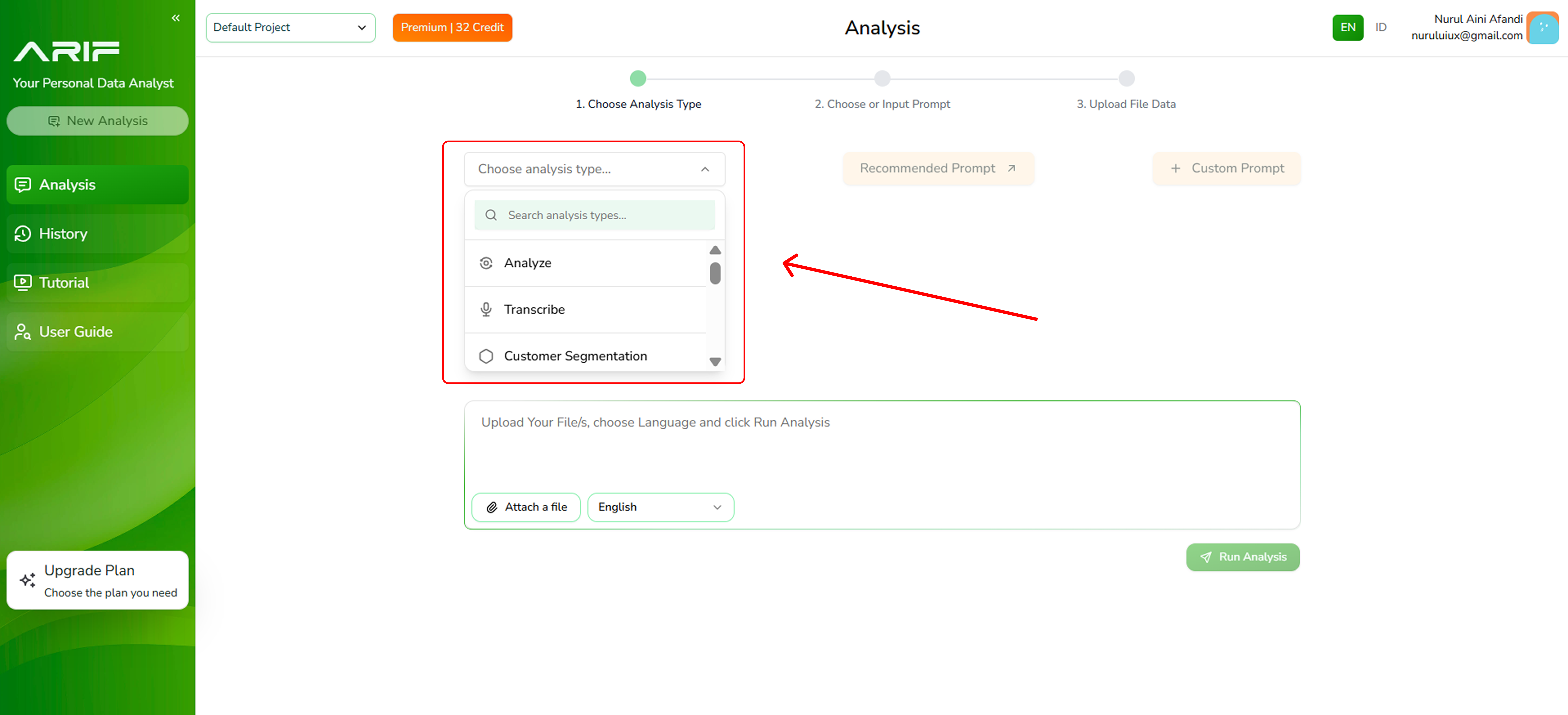 - Click “Choose analysis type” dropdown in the main menu then select “Transcribe”.