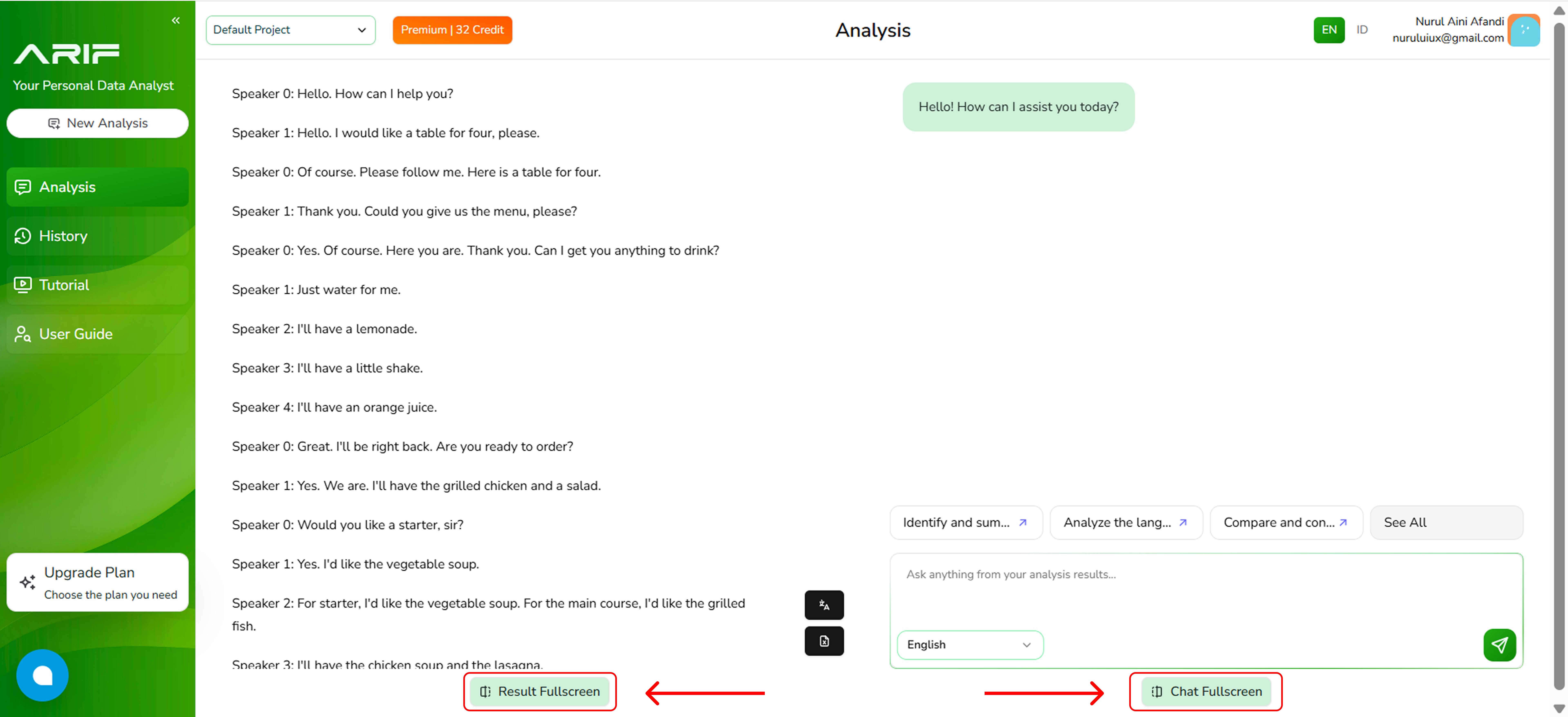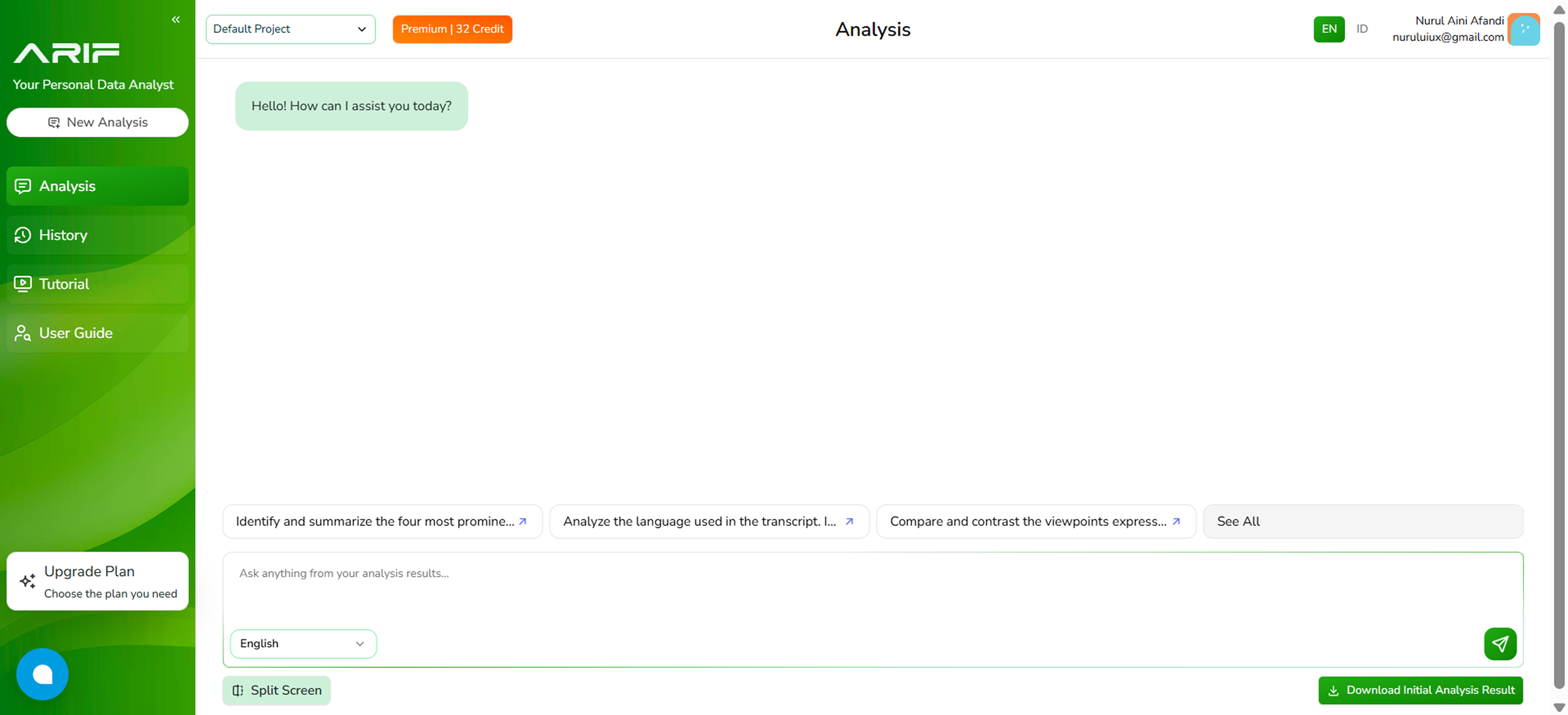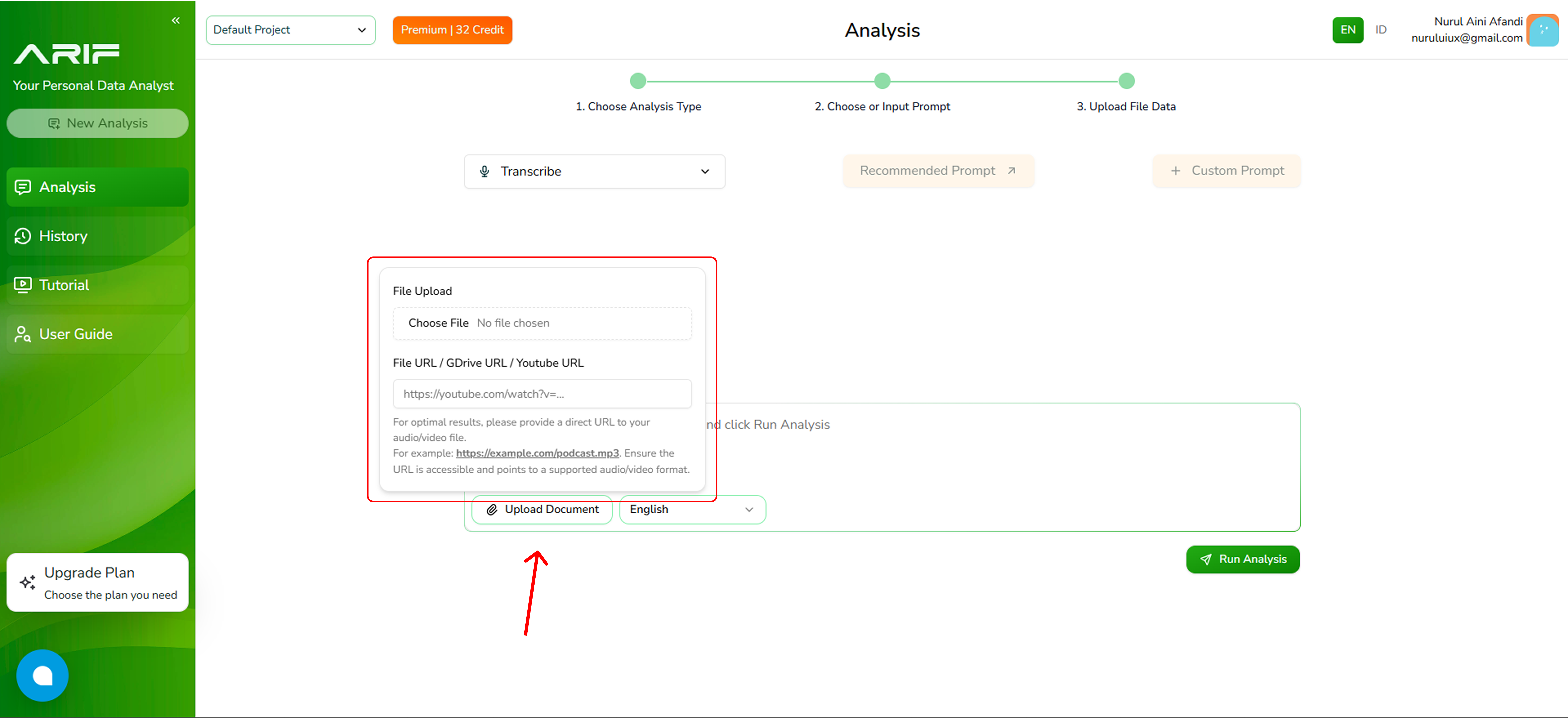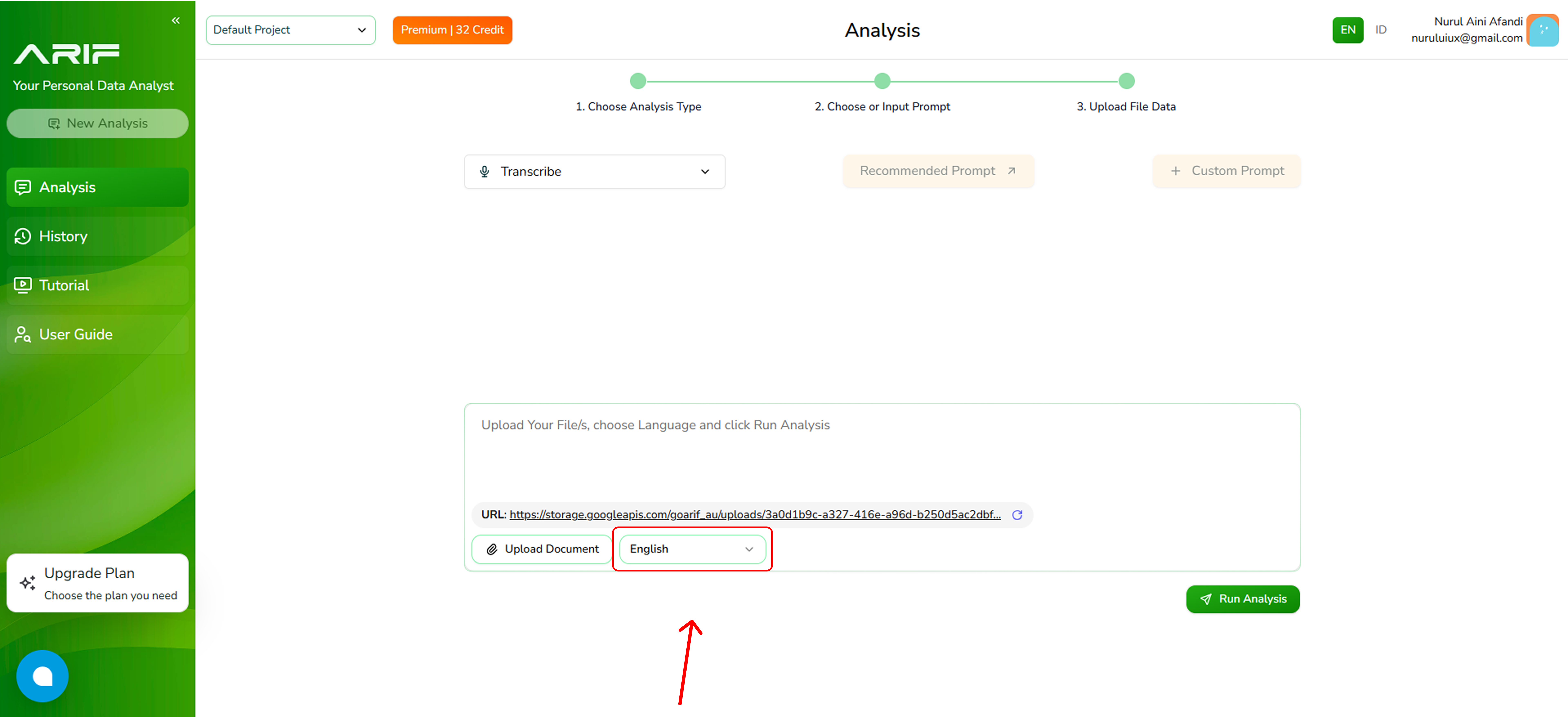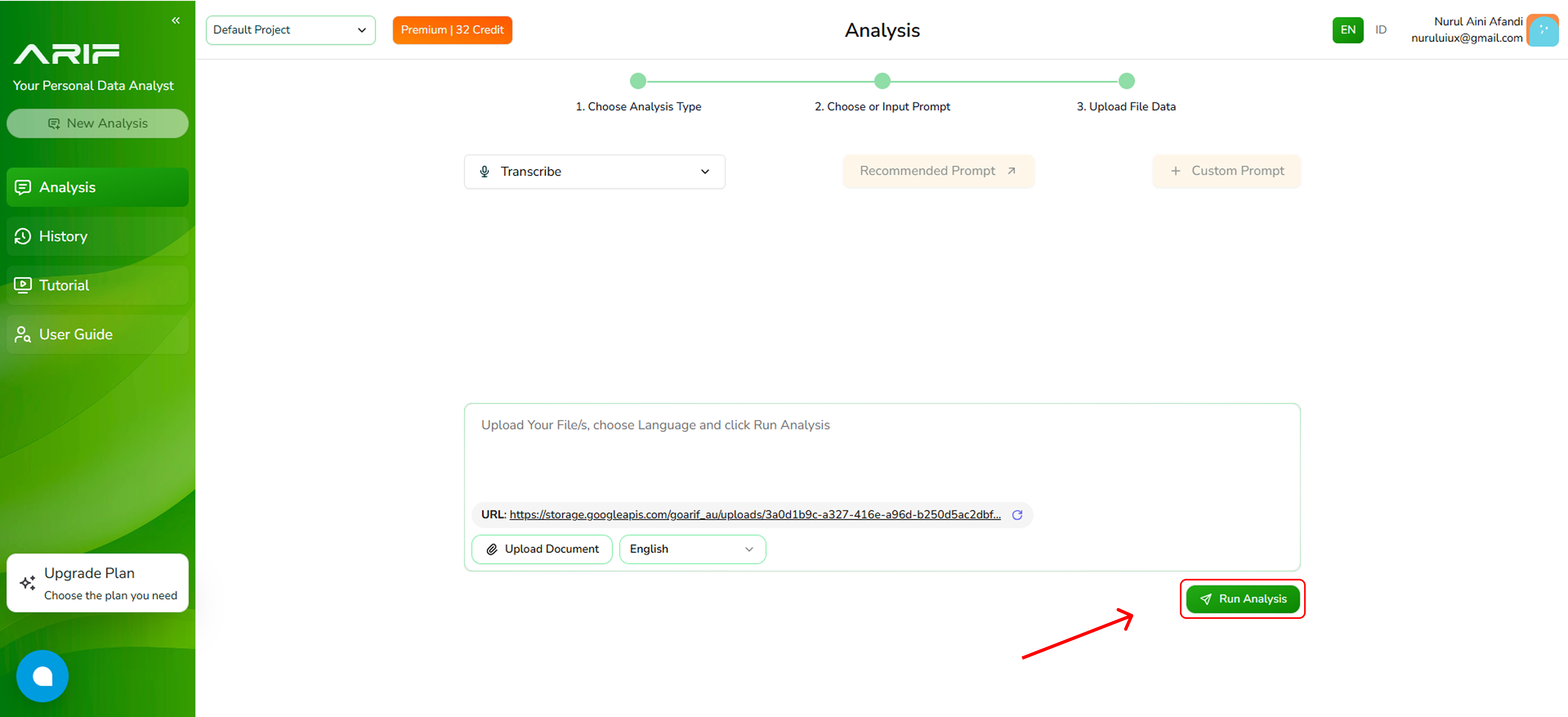 - Once uploaded, then click “Run Analysis” button and wait for the transcription to complete. The processing time depends on the file size.